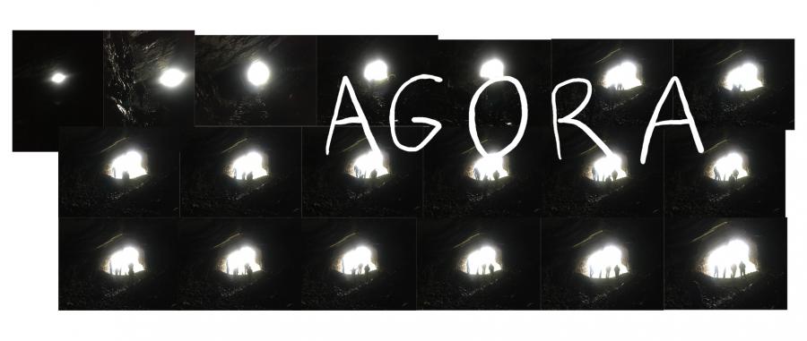 " Cette pièce est une évocation directe à l’accès à l’information, à la connaissance, au savoir. C’est une planche-contact monumentale dans laquelle une série d’images fixent l’embouchure d’une grotte au travers de laquelle on voit apparaitre progressivement différentes silhouettes en contre-jour. Une camera obscura inversée qui n’est pas sans rappeler la caverne de Platon, cette volonté de sortir de l’illusion, des croyances et des préjugés. Se retrouver dans cet entre-deux, dans ce passage, entre l’obscurité et la lumière, là où l’on garde les yeux mi-clos, là où l’on se permet le doute."