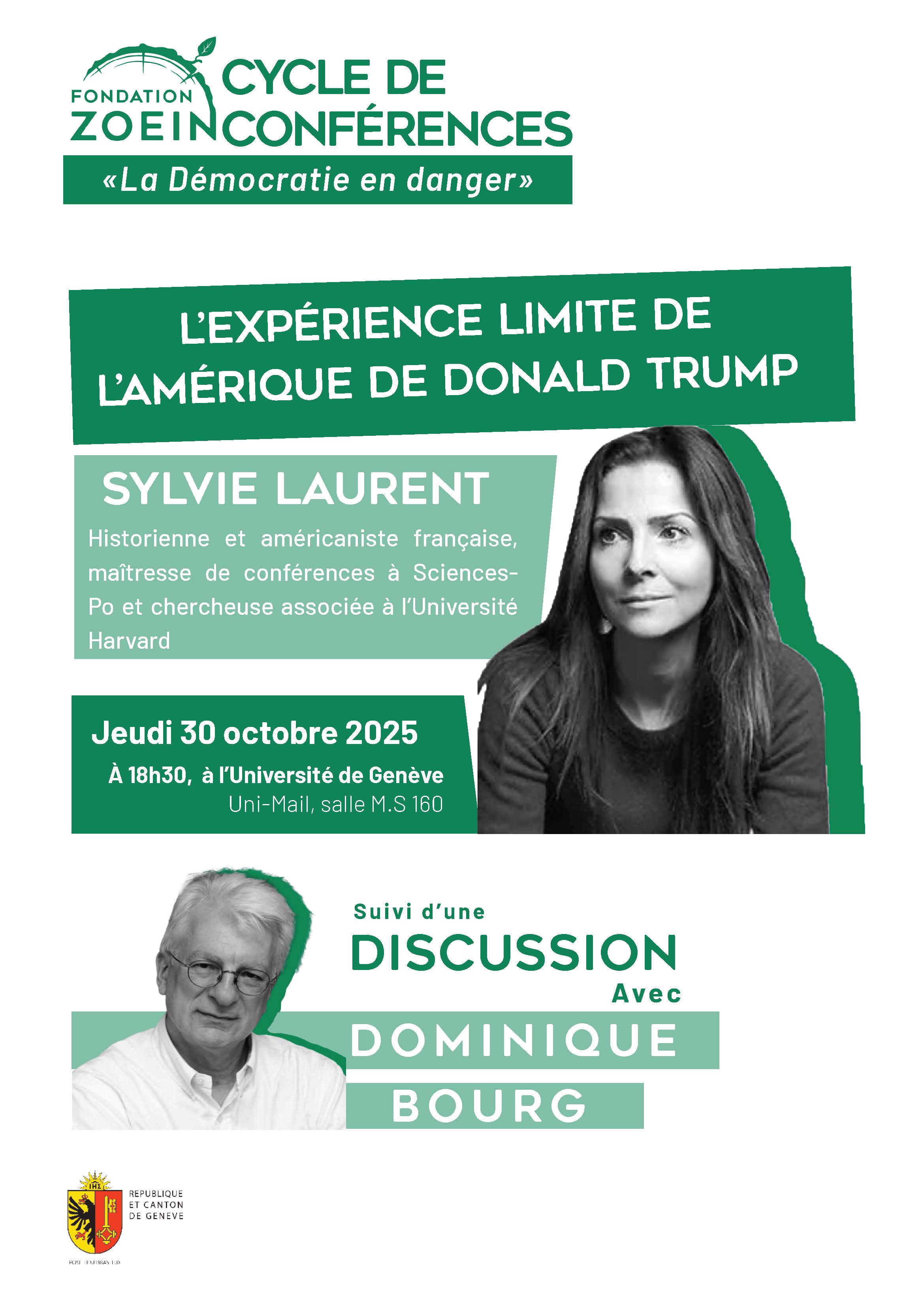 La Fondation Zoein est heureuse de vous inviter le jeudi 30 octobre 2025 à 18h30 à la conférence de Sylvie Laurent, historienne et américaniste française à Sciences-Po et chercheuse associée à l'Université Harvard, intitulée "l'expérience limite de l'amérique de Donald Trump".
