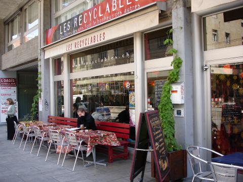 Les Recyclables sont à la fois une librairie de livres d'occasion récents, et un café restaurant qui propose également des animations (concerts, lectures etc). Le développement durable est au centre de la démarche du lieu, qui fut lauréat de la Bourse Cantonale du Développement Durable en 2005.